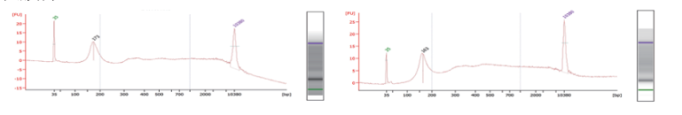 产品应用3:取2份肿瘤病人血浆样本,每份2ml,用UPure Circulating Tumor DNA Kit提取产物2100 检测结果: