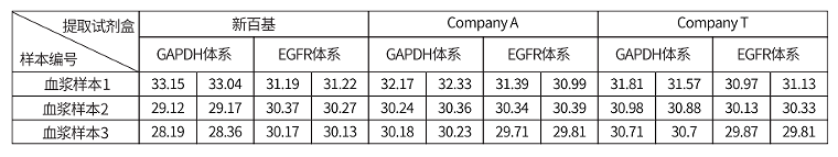 产品应用1:取3份血浆(6ml/份),各分装成3支血浆(2ml/支),分别用新百基、Company A和CompanyT的血浆DNA提取试剂盒进行提取,通过GAPDH体系和EGFR体系进行定量检测: