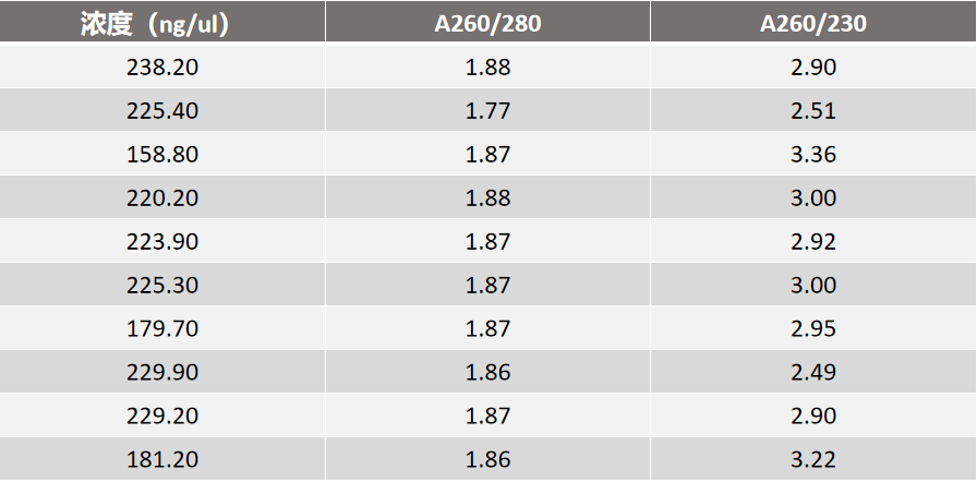 产品应用:取10份5ml冷冻血液样本,使用UPure Blood DNA Extraction Plus Kit提取基因组DNA,400µl洗脱液洗脱。