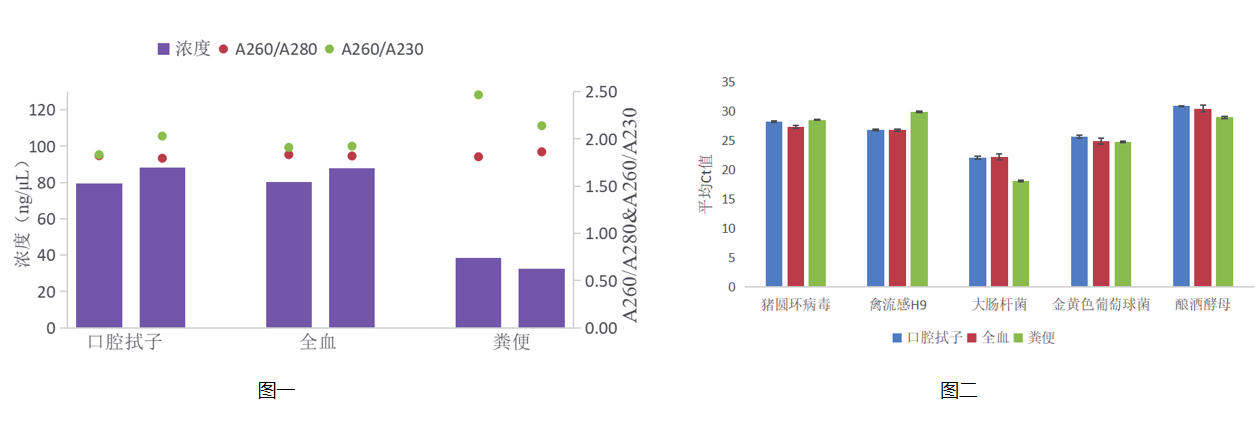 将大肠杆菌、金黄色葡萄球菌、酿酒酵母和猪圆环病毒、禽流感H9疫苗稀释液添加至口腔拭子、全血、粪便样本中,按照新百基微生物核酸提取试剂盒的流程进行提取,提取产物进行浓度纯度测定(如图一),并通过荧光定量PCR对提取得到的微生物核酸进行定量(如图二)。