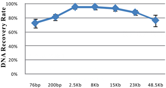 • 回收片段范围广:70bp~50kb• 结合效率高:每50µl磁珠可以结合5µg DNA • 不同片段大小均有高的回收效率• 解决了柱纯化方法无法回收大片段的问题