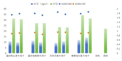 产品应用:取20mg不同种类的牛肉干,用新百基提取试剂盒提取,提取产物经PCR检测