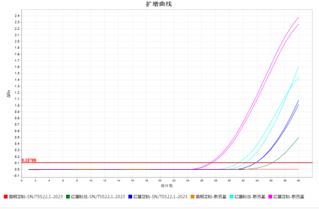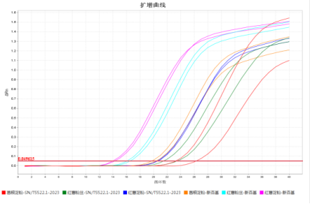 产品应用:100mg红薯淀粉、红薯粉丝粉末、葛根淀粉分别用SN/T 5522 《食用淀粉植物源成分鉴别方法 实时荧光PCR法》方法和新百基食用淀粉及其制品DNA提取试剂盒进行提取。使用Qubit检测提取产物浓度,并分别用植物内参照引物探针和红薯特异性的引物探针进行PCR扩增。