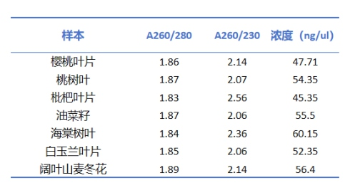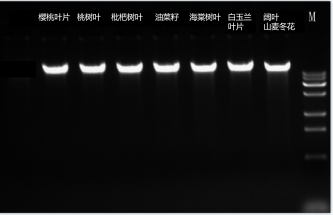 分别称取100mg樱桃树叶、桃树叶、⽯榴树叶、杨梅树叶、海棠树叶、合欢树叶、菊花花朵、菊花叶,按照本试剂盒说明书进⾏DNA提取,产物进⾏浓度和电泳检测。