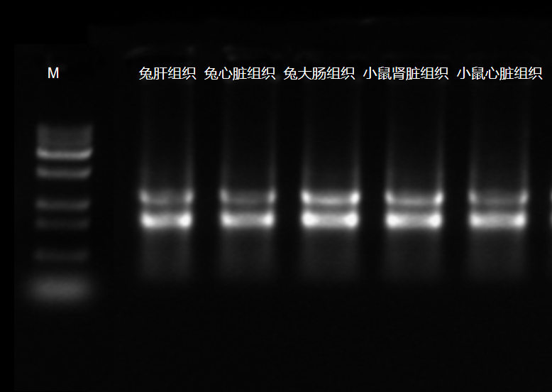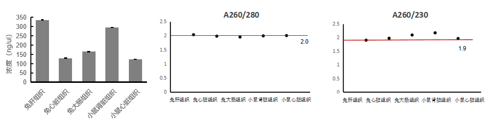 产品应用:分别称取兔肝脏组织,兔心脏组织,兔大肠组织,小鼠肾脏组织,小鼠心脏组织各3份,每份11mg,用新百基柱法动物组织/细胞RNA提取试剂盒提取样本中RNA,产物进行浓度,纯度和电泳检测。结果显示:此试剂盒对不同动物不同组织样本RNA提取,都有较高得率,纯度高,片段完整性良好。